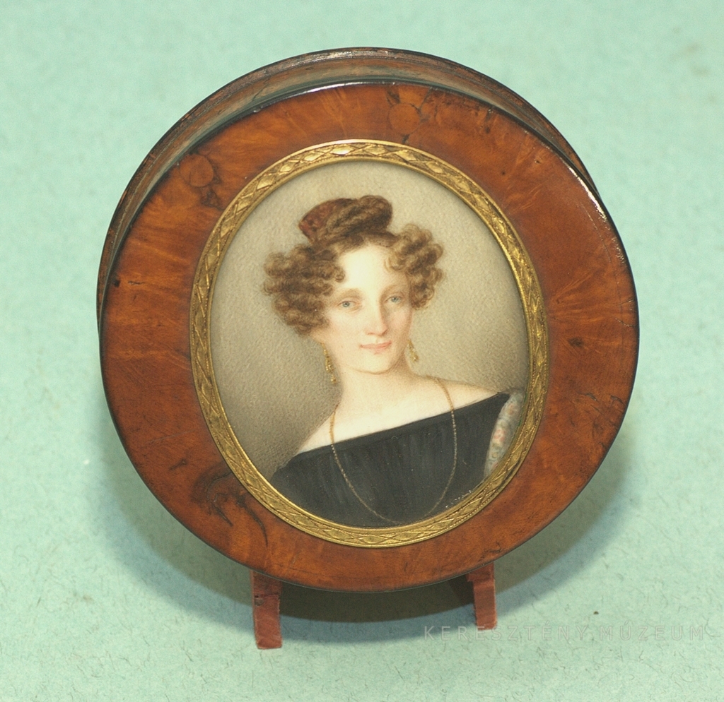 Fedelén ovális, vésett, réz keretben fiatal nő festett miniatúrája