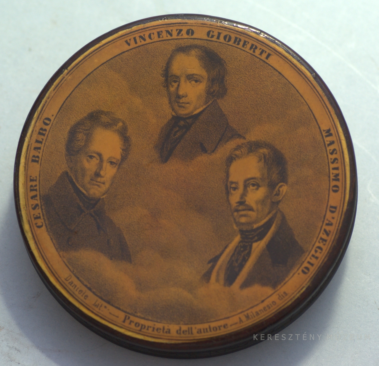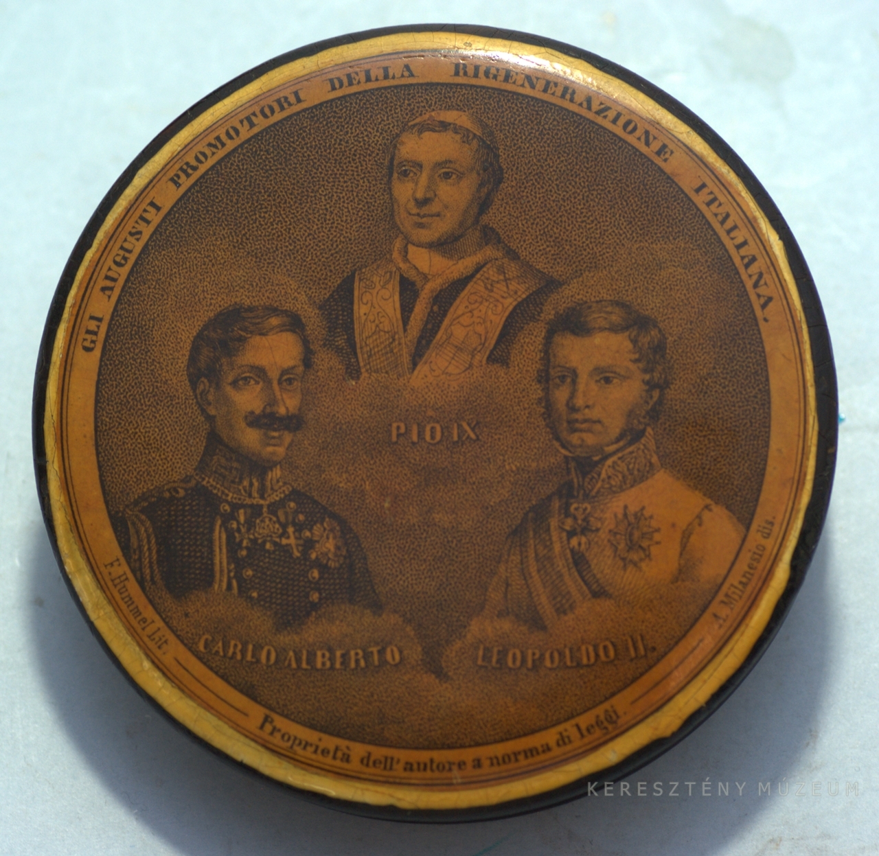 Elő- és hátoldalán litografált portrék: IX. Pius pápa; Károly Albert, szárd-piemonti király; II. Lipót, Toszkána nagyhercege; Massimo d'Azeglio, Vincenzo Gioberti, Cesare Balbo, Szardinia miniszterelnökei