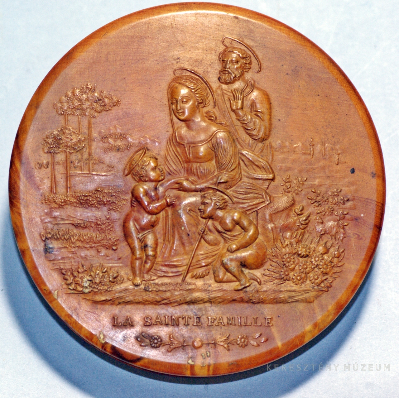 Fedőlapon a Szent Család, és Keresztelő Szent János ábrázolása, teknőc héj betét