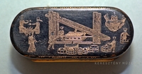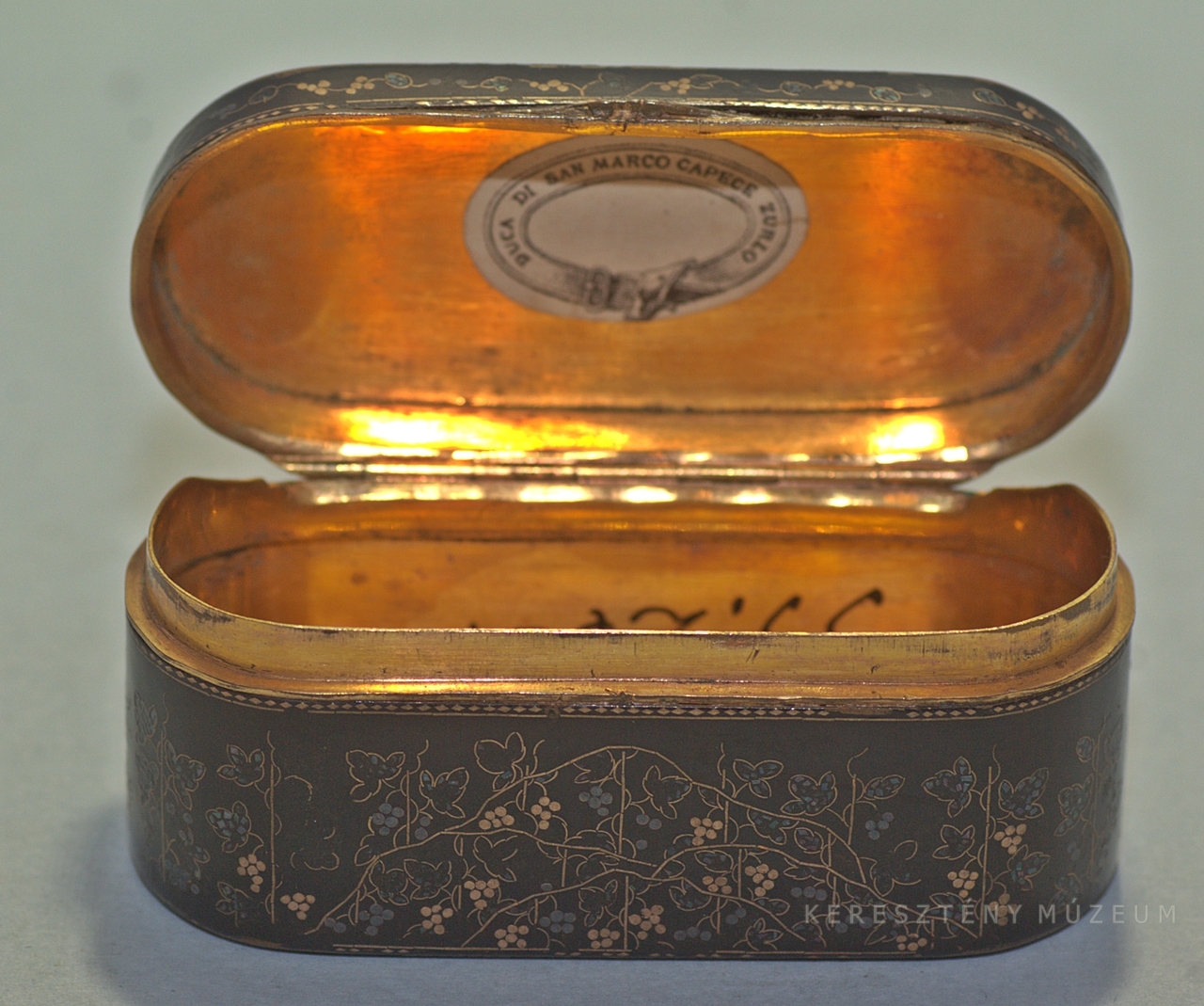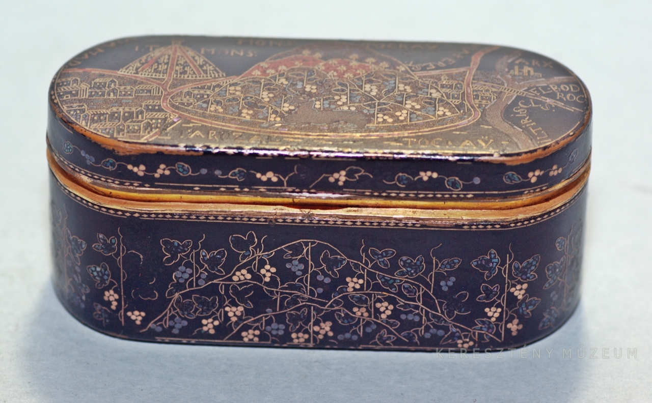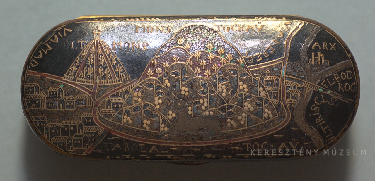 Felnyíló fedelén Tokaj hegye szőlőültetvényekkel, palástján fürtökkel teli szőlőindák, alján szüreti munkálatok