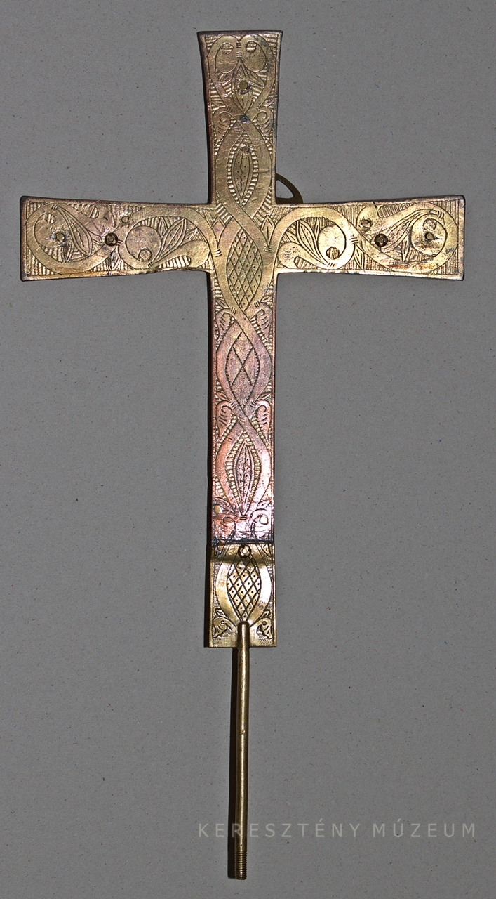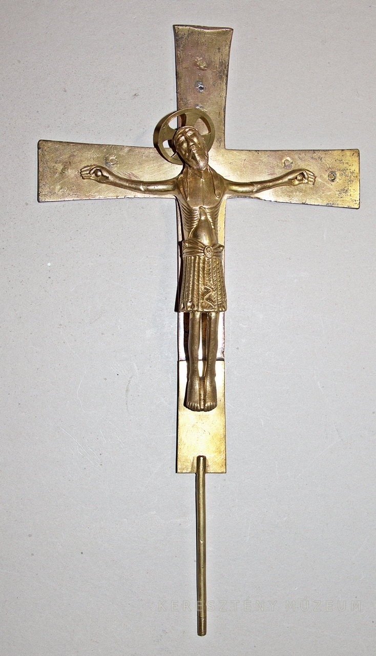 Plasztikus Krisztus-testtel, rúdba tűzhető szárral, hátlapon indás-leveles vésett díszítménnyel.