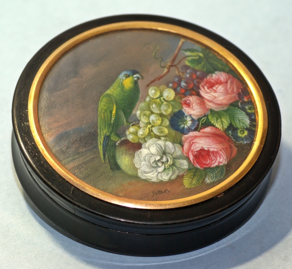Kerek formájú, leemelhető fedéllel. Fedelén pergamenre festett csendélet.