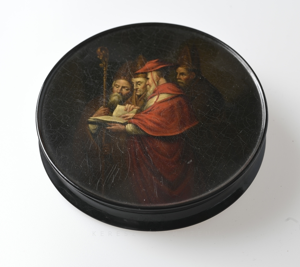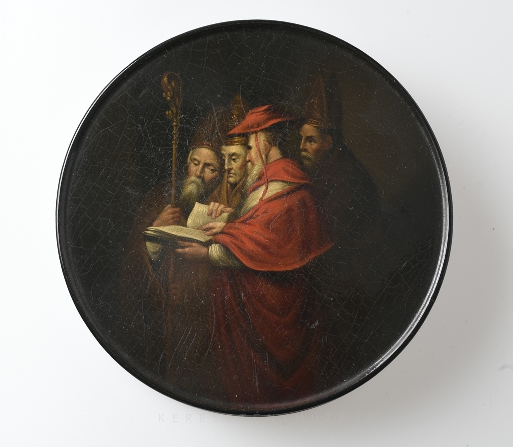 Kerek formájú, leemelhető fedéllel, rajta jelenet, Rubens után.