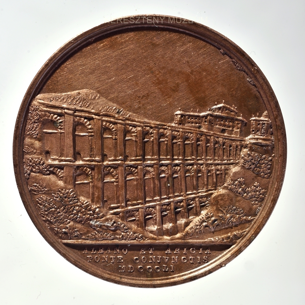 Előlap: a pápa mellszobra bal profilból, stólával, fején pileolus.|Hátlap: Az Ariccia híd, Róma mellett, amely Albano és Aricia városait köti össze. 1847 és 1854 között épült, a Pápai Állam támogatásával, XVI. Gergely és IX. Piusz pápasága alatt. A híd 72 méter magas, 312 méter hosszú, kétszintes köríves szerkezettel, Ireneo Aleandri építész, az ókori aquaduct-ok mintájára tervezte meg.