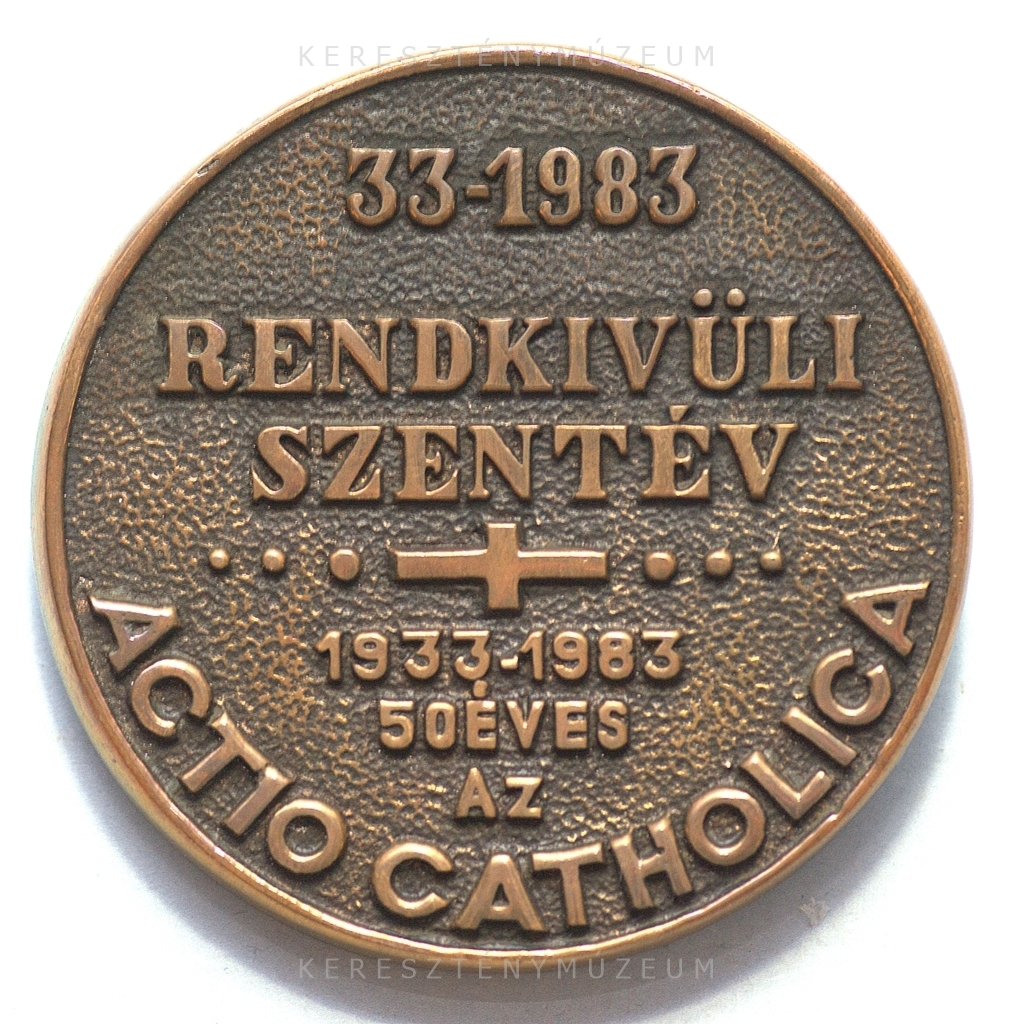 1983-ban kiadott, magyar emlékérem a Megváltás rendkívüli Szentévének meghirdetésére. 1983. január 6-án hirdette ki Szent II. János Pál pápa a „Aperite Portas Redemptori” („Tárjátok ki a kapukat a Megváltó előtt”), című bulláját a Megváltás 1950. évfordulója, és a rendkívüli Szentév kihirdetése alkalmából. A jubileumi év meghirdetése egybeesett az Actio Catholica magyarországi szervezete alapításának 50. évfordulójával. Előlap: Hármas gyűrűben, Krisztus-arc, kettős koronával - királyi és tövis korona.
