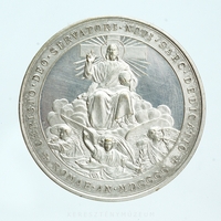 1900. évi jubileum emlékérme. Előlap: A gyűrűben a négy római partiarchális bazilika (Szent Péter, Lateráni, Santa Maria Maggiore, Falakon kívüli Szent Pál), homlokzati képe veszi körül a pápa arcképét. Hátlap: Sugárzó kereszt előtt, a felhőkön trónoló jobbjával áldást adó Krisztus, baljában kereszttel díszített országalmát tart. Lábánál két angyal kürtöli világgá a szentévet, egy angyal babérágat tart felhők között. XIII. Leo új évszázad első szentévét a Megváltó Krisztusnak (Krisztus királynak) szentelte.
