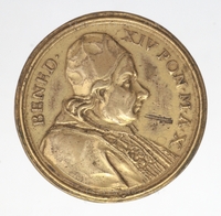 Enyhén kopott, jubileumi emlékérem az 1750-es Szentév és Szent Kapu megnyitásáról. XIV. Benedek pápa 1749. május 5-én, a Peregrinantes a Domino bullával nyitotta meg a jubileumi Szentévet. Előlap: a pápa arcképe jobb profilból, vállán mocétum és stóla, fején camauro. Hátlap: a pápa vállán palást, fején tiara, kezében kalapács, mögötte a püspöki asszisztencia, és a pápai testőrség. Szemben térdelő, imádkozó zarándokok. A kibontott téglák a kapu elé hullanak, a nyitott résen fentről, sugaras fénycsóva jelenik meg.