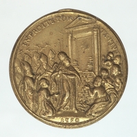 Jubileumi emlékérem az 1750-es Szentév és Szent Kapu megnyitásáról. Előlap: a pápa vállán palást, fején tiara, kezében kalapács, mögötte a püspöki asszisztencia, és a pápai testőrség. Szemben térdelő, imádkozó zarándokok. A kibontott téglák a kapu elé hullanak, a nyitott résen fentről, sugaras fénycsóva jelenik meg. Felirata a 100. Zsoltárt idézi: "Menjetek be kapuin hálaénekkel" Hátlap: a római Szent Lépcső, a Scala Santa , amelyen a zarándokok csak térdelve, imádkozva haladnak felfelé. A 28 fokból álló márvány lépcsőt a legeda szerint Szent Ilona hozatta Jeruzsálemből Rómába. Ezen a lépcsőn lépkedett fel Krisztus az őt halálra ítélő Pilátushoz. Kétoldalt az apostol-fejedelmek, Szent Péter és Szent Pál egész alakos ábrázolásai attribútumaikkal (Péter-kulcs, Pál-kard).