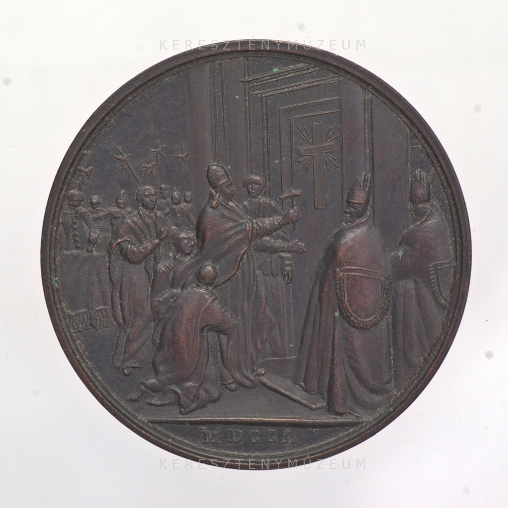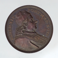 1750. június 29-én kibocsátott éves érem, a Szent Péter-bazilika Szent Kapu nyitásának emlékére. XIV. Benedek pápa 1749. május 5-én, a Peregrinantes a Domino bullával hirdette meg a jubileumi Szentévet. Előlap: a pápa arcképe jobb profilból, vállán mocétum és stóla, fején camauro. Hátlap: a pápa kalapácsával megüti a Szent Kapu zárt falazatán elhelyezett sugaras, latin keresztet. Vállán palást, fején a pápai hármas korona, a tiara. Mellette térdelő diakónusok, jobbról a püspöki asszisztencia, háttérben a Svájci Gárda alabárdosai.