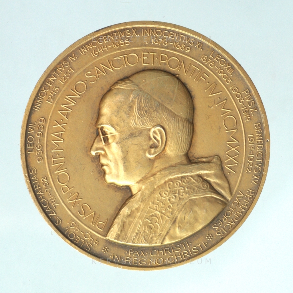 Előlap: SILVESTER II 991-1003 GREGORIVS VII 1073-1085 GREGORIVS IX 1227-1241 NICOLAVS V 1447-1455 CALLIXTVS III 1455-1458 LEO X 1513-1521 CLEMENS VIII 1592-1605 INNOCENTIVS XI 1676-1689 LEO XIII 1878-1903 PIVS X 1903-1914 BENEDICTVS XV 1914-1922 PP. MM • HVNGARRIAE • FAVTORES * PAX • CHRISTI IN • REGNO • CHRISTI *| PIVS • XI • PONT • MAX • ANNO • SANCTO • ET • PONTIF • IV • MCMXXV • | Hátlap: PAX • HOMINIBVS • __ • BONAE • VOLVNTATIS •