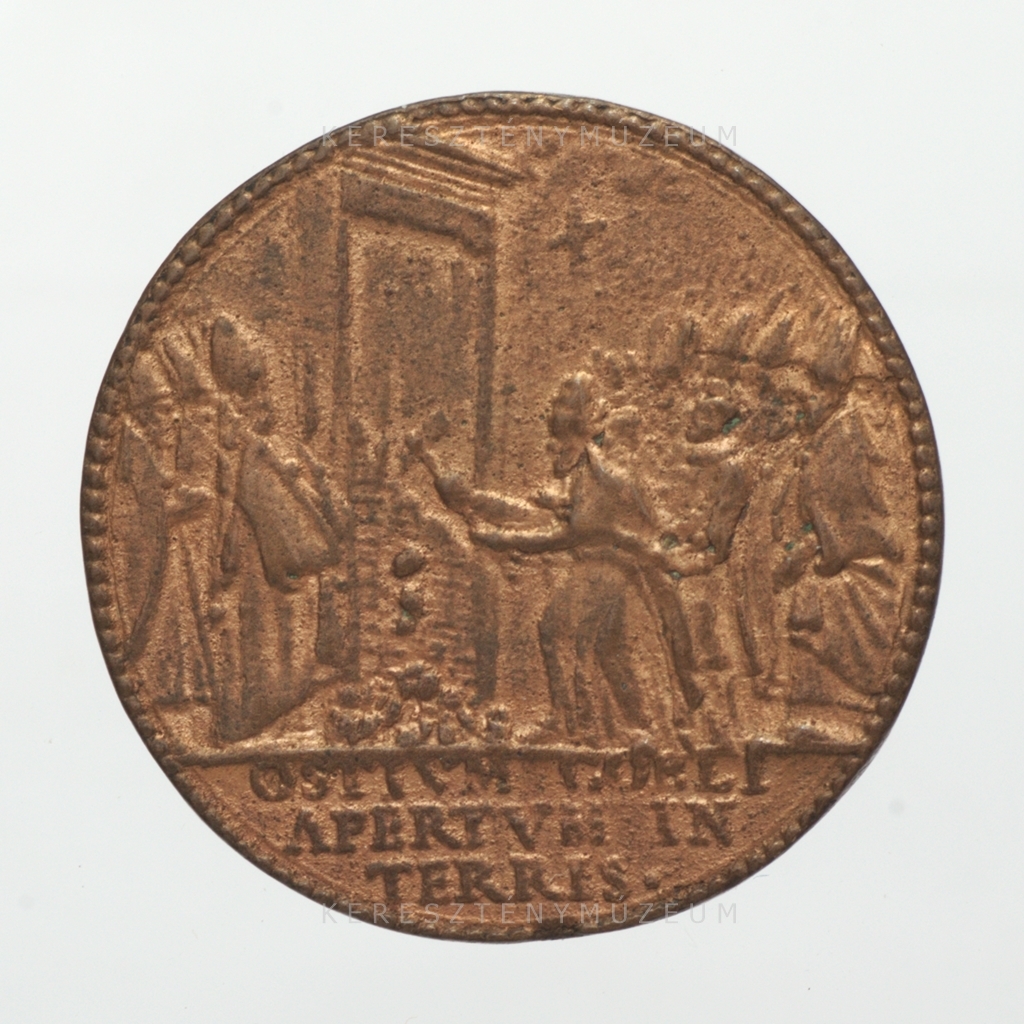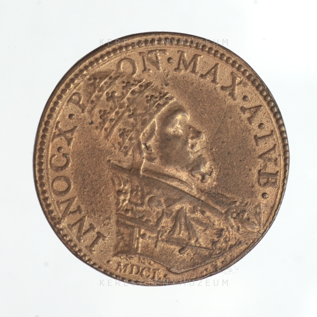 Erősen kopott, éves érem, 1650. június 29-én adták ki a Szent Péter bazilika, Szent Kapu megnyitásának emlékére. A pápa 1649. május 13-án, Krisztus mennybemenetelének (Ascensio Domini) ünnepén olvasta fel a Szent Péter-bazilika templomkertjében Appropinquat, dilectissimi filii bullát, amellyel meghirdette a következő Szentévet. Előlap: gyöngysoros keretben a pápa arcképe jobb profilból, vállán palást, fején tiara. A palást hímzésén Szent Pál apostol a karddal. Hátlap: gyöngysoros keretben a pápa csákánnyal kibontja a Szent Kapu tégláit, amelyek halomba hullanak a szemben álló püspöki asszisztencia elé.