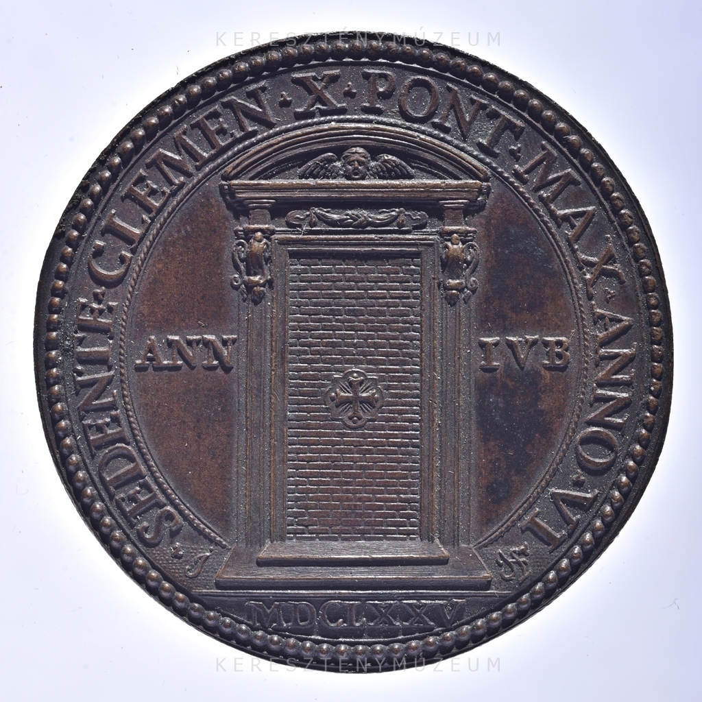 Előlap: I * SEDENTE * CLEMEN * X * PONT * MAX * ANNO * VI __ HS | Középmezőben: ANN __ IVB | Szelvényben: MDCLXXV | Hátlap, mondatszalagon: ET • PVLSANTI • APERIETVR | Kartusban: FLAVIVS|S • R • E • CARD • CHISIVS|S•S•LATERANEN•ECCL•|ARCHIPRESB•|APERVIT ET CLAVSIT | * |