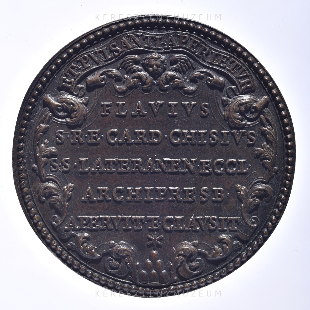 Magánkiadású érem a felirat szerint X. Kelemen pápa idejében Flavius Chisius bíboros megrendelésére, a Szentév, a lateráni Keresztelő Szent János bazilika Szent Kapujának kinyitása és zárása emlékére. Előlap: kettős gyöngysoros keretben, a befalazott Szent Kapu, középen görög kereszttel. A timpanonban szárnyas angyalfej. Hátlap: gyöngyös keretben fent íves mondatszalag magyarul: aki zörget, annak ajtót nyitnak (Mt 7,7-8). Középmezőben levéldíszes kartus, fent szárnyas angyalfej, lent a bíboros címeréből kiemelt alakzat zárja. Középen ötsoros, latin nyelvű szöveg a megrendelő megnevezésével.