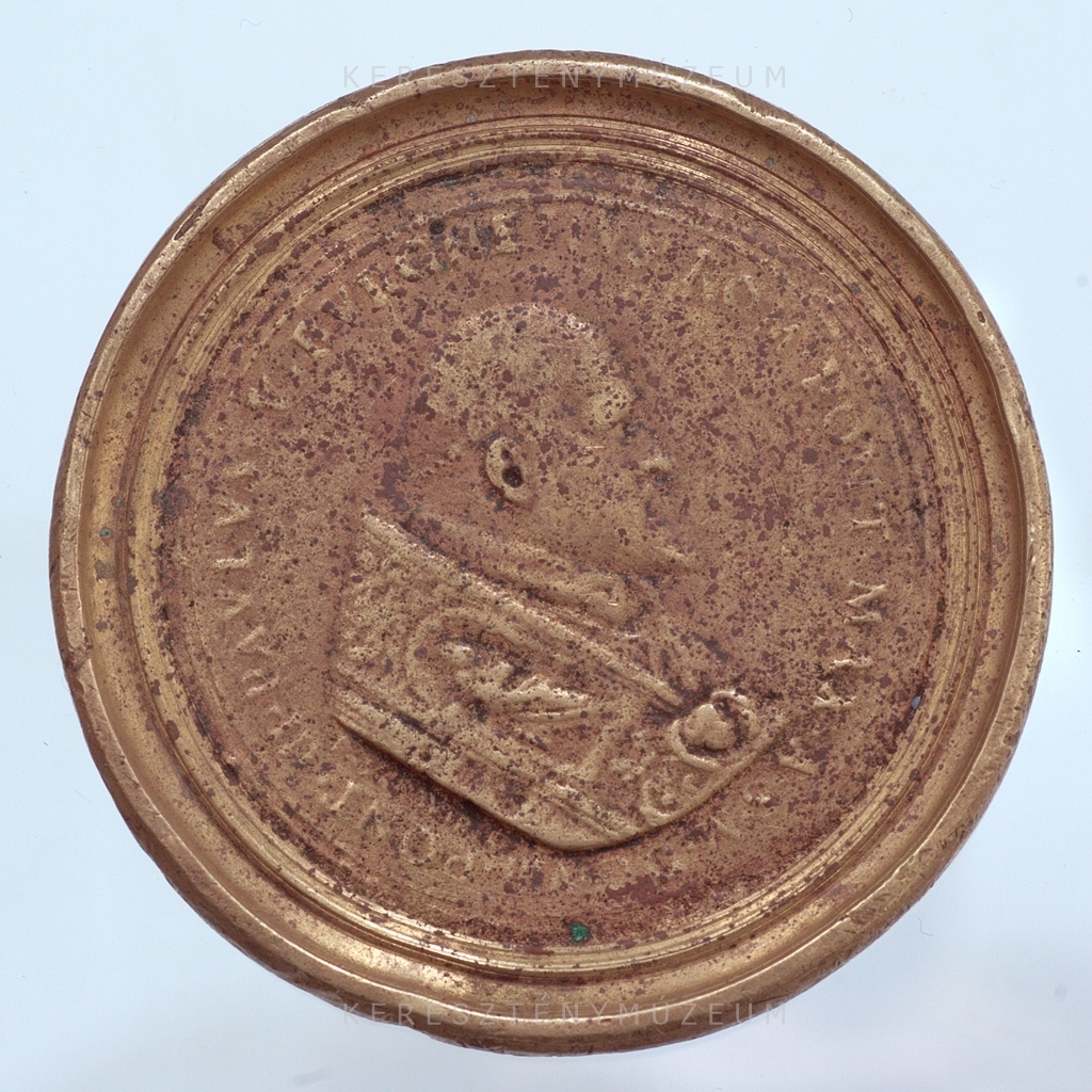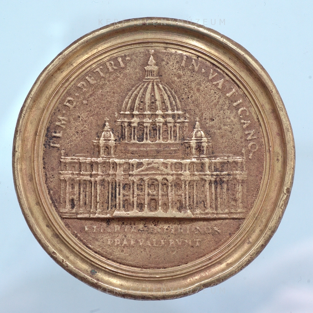 Rendkívüli öntött érem, magasított, préselt gyűrűben, a Szent Péter bazilika-homlokzati rész építésének alapkő letételére, amely 1608. február 10-én történt. Előlap: a pápa jobb profilú arcképe, vállán palást. Hátlap: a Szent Péter bazilika homlokzati képe, még a harangtornyok nélkül. Erősen kopott.
