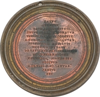 Széles sárgaréz gyűrűben, gyöngysorral keretelt, patinázódott bronz mező, perem átfúrva függesztésre. Előlap: jobbra néző portré, reverendában és köpenyben. Feje fedetlen, felette aureola. Hátlap: középre zárt, 15 soros latin szöveg