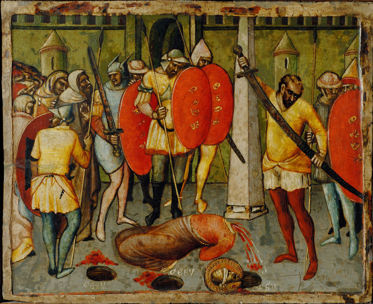 Róma városfalain kívül, a városkapu előtt éppen végrehajtják az ítéletet. A helyszínt meghatározza a piramis, Caius Cestius praetor (Kr. e. 12) síremléke a Pál-kapu közelében. Az elő térben a térdelésből hátrahanyatlott, hátrakötözött kezű, le fejezett szent holtteste jelenik meg, nyakából ömlik a vér. A földön három nagy vérfolt és mélyedés, amely Szent Pál lefejezésekor keletkezett és forrás fakadt belőlük. A legenda szerint Pál apostol feje háromszor kiáltotta Jézus nevét, utolsó szavait olvashatjuk a mélyedések mellett: Gesü (Jézus). Jobb oldalt a sárga inges hóhér helyezi vissza pallosát a hüvelyébe. Körülötte római katonák pajzsokkal és dárdákkal tartják vissza a balról közeledő tömeget. Prokopp Mária 1993