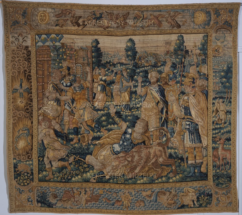 Dr. Csernyánszky Mária szerint egy ószövetségi jelenetet ábrázol a kárpit, mely a Királyok első könyvében (20, 35-37) olvasható. (feljegyzés 1984-ből a múzeum iratai között).