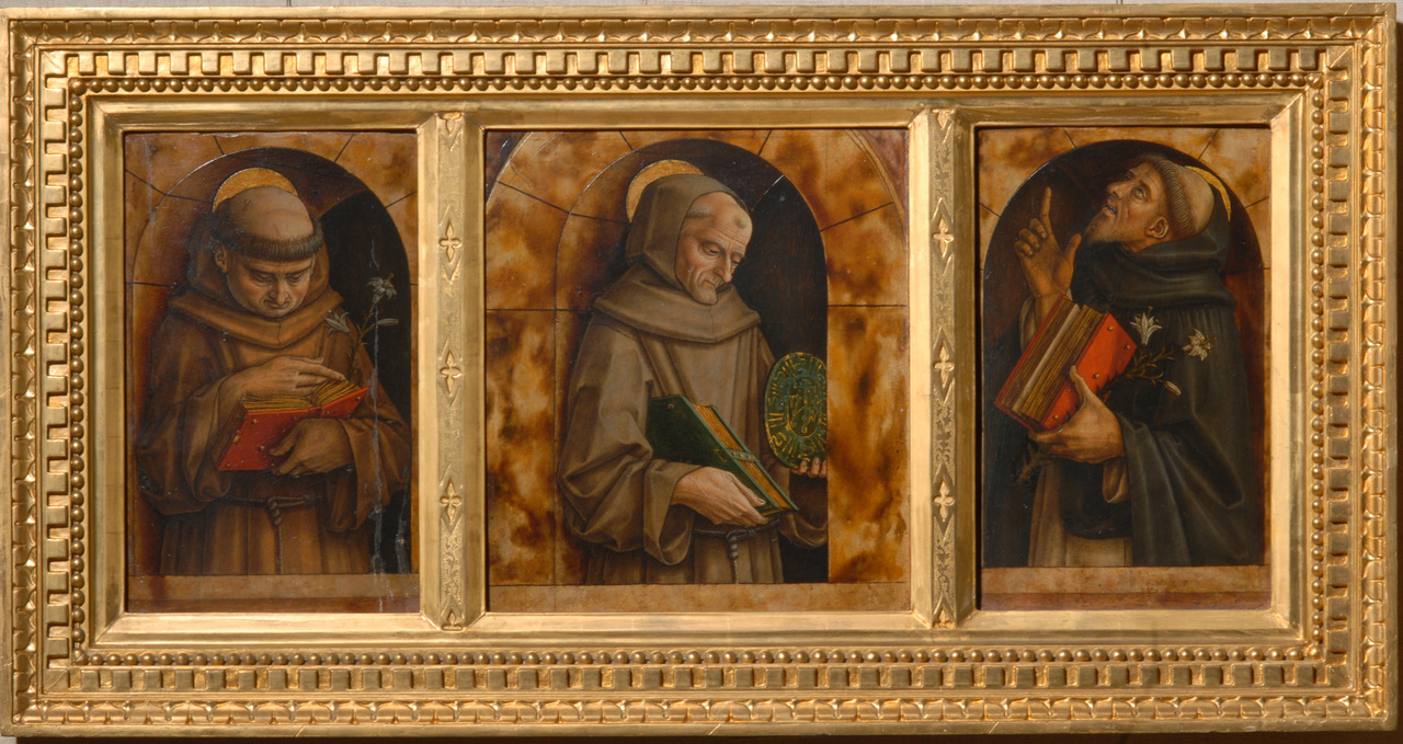 A három koldulórendi szerzetest – két ferences szentet, valamint a domonkos rendnek a ferencesek által is tisztelt névadó szentjét – ábrázoló három kis kép a fabrianói San Francesco templom egykori oltárpredellájának töredéke. Az oltár többi darabja is ismert: a főkép (Mária koronázása) és a lunetta (Pietà) a milanói Brera képtár tulajdona, a predella egykori közepét elfoglaló Áldó Krisztust és egy Szent Onofriust ábrázoló töredéket a római Angyalvár őrzi, két, egyenként három szentet ábrázoló darab pedig a párizsi Jacquemart-André múzeumba került. A főtáblán olvasható felirat szerint az oltár Carlo Crivelli 1493-es – tehát utolsó dátum szerint ismert – műve. Carlo Padovában és hazájában, Velencében tanult, de egy erkölcsi botrányt követően menekülnie kellett szülővárosából. Ezután élete végéig Dalmáciában és a Marche-vidéken festette rendkívüli műgonddal kivitelezett képeit, rafináltan dekoratív, száraz stílusát gyakran szelíd iróniával fűszerezve. Képeit konzervatív ízlésű megrendelői igényeihez igazította, de kortársainak vívmányaira is figyelt: az alakok itt például egy illuzionisztikusan megfestett reneszánsz architektúra terében jelennek meg. Sallay Dóra 2002-honlap