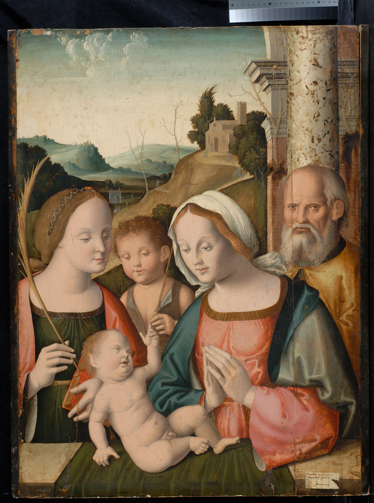 Ugyanennek a kompozíciónak töredékesen fennmaradt vál tozatát a Szépművészeti Múzeum raktára őrzi, egy másik variánsa — melyen Szent Sebestyén Szent Katalinnal szerepel — szintén a Keresztény Múzeum kincse. A két variánson már nem olvasható évszám, így nem tudjuk, mennyivel ké szültek az itt reprodukált 1529-es példány előtt vagy után. Feltehető, hogy Palmezzano és műhelye akár több éven át is felhasználta ugyanazokat a kompozíciós sémákat, ha a meg rendelők körében sikeresnek bizonyultak. Marco Palmezzano legkiválóbb művei a századfordulót megelőző és követő néhány évből származnak. Ekkoriban még frissen éltek benne a Melozzo da Forli mellett tanultak, képeinek a tiszta térkonstrukció, a ragyogó színek és a plasztikus erő adott magas művészi rangot. A többnyire Forliban működő festő a későbbiek során már nem érte el azt a színvonalat, amelyet például a milánói Brera-beli Mária megkoronázása képvisel. Kompozícióinak szerkezeti szigora meglazult, gyakran esett a modoros önismétlés hibájába, művészete némiképp provinciális jelleget öltött. Anélkül, hogy a cinquecento újí tások érintették volna, mindvégig megmaradt a padovai, ve lencei, ferrarai quattrocento-tradíciók folytatójának. A kései mű adoráló Máriája előtt zöld drapériával borított mellvéden ül az ég felé mutató kis Jézus. Baloldalt a könyvet és pálmaágat tartó Szent Katalin áll, jobboldalt a párkányos pillér és a színes márványoszlop motívuma által kiemelve, a többi szereplőtől elkülönülve, Szent József néz ránk komoly, prófétai tekintettel. Mária és Szent Katalin között a gyermek Keresztelő figurája jelenik meg. Az öt szereplő a mozdulatok és tekintetek egymásra vonatkoztatása ellenére sem alkot iga zi csoportot, inkább egymás mellé és mögé helyezett mell szobroknak hatnak. Valamivel lendületesebb rajzú a háttér beli táj az ívelő hegyekkel és a dús lombú fák között előbuk kanó templom hangulatos részletével. Tátrai Vilmos 1993