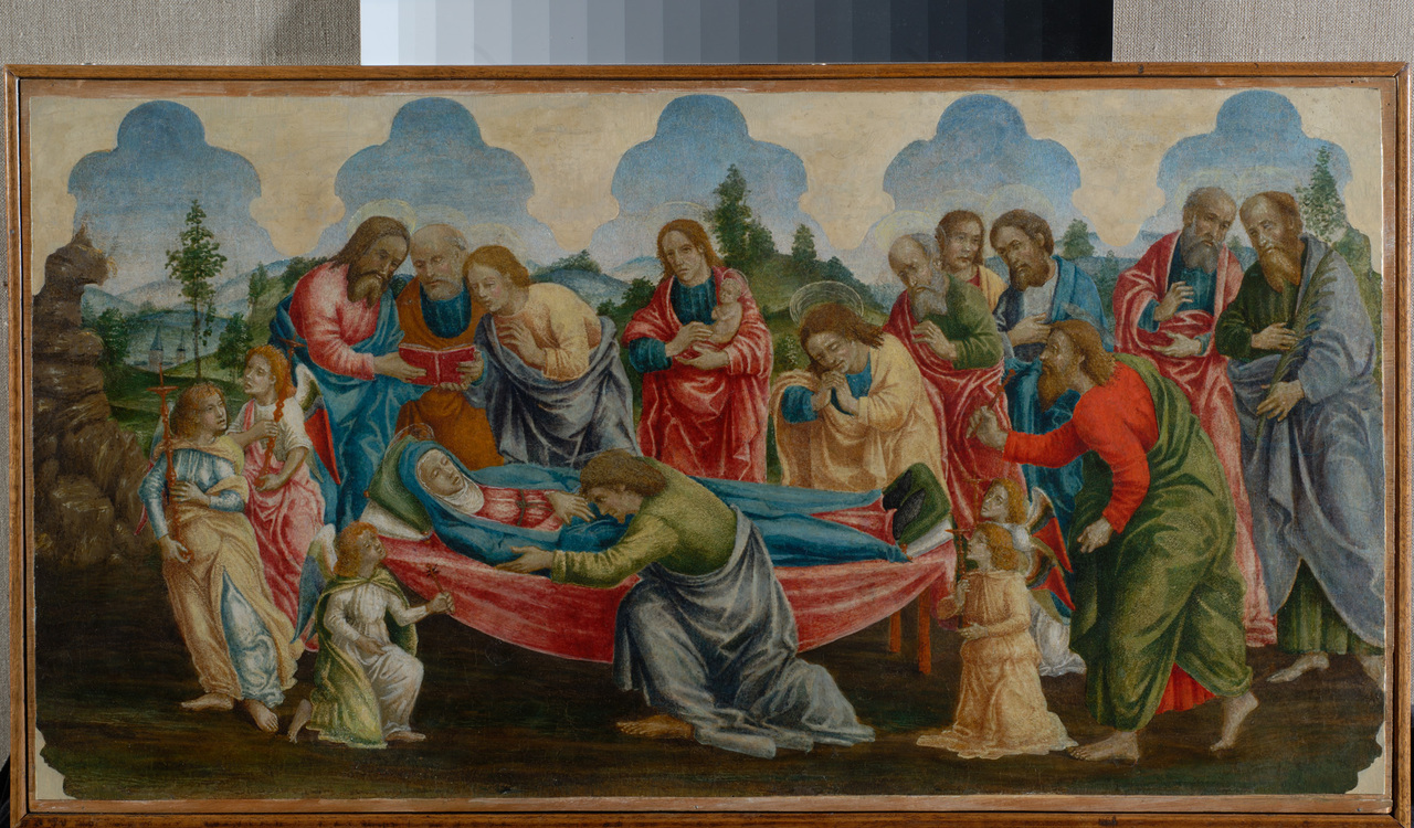 Az apostolok és angyalok kettes, hármas csoportokat alkotnak, néhány szereplő pedig különvált a többitől. Három apostol egyazon könyv fölé hajol, jobboldalt ketten egymás felé fordulva beszélgetnek, előregörnyedve, füstölővel közeledik egy apostol, egy másik meg térdre borulva öleli a halott Máriát. A jelenet minden résztvevőjét eleven mozgás, izgatottság, misztikus hevület járja át. Tátrai Vilmos 1993