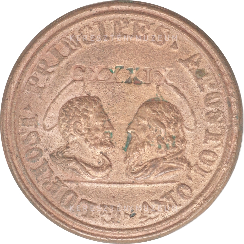 Sima perem, természetes patinával. Előlap: a pápa mellképe jobbról. Vállán mocétum és pallium, feje fedetlen. Hátlap: Szent Péter és Szent Pál apostolok egymással szembe néző mellképei.