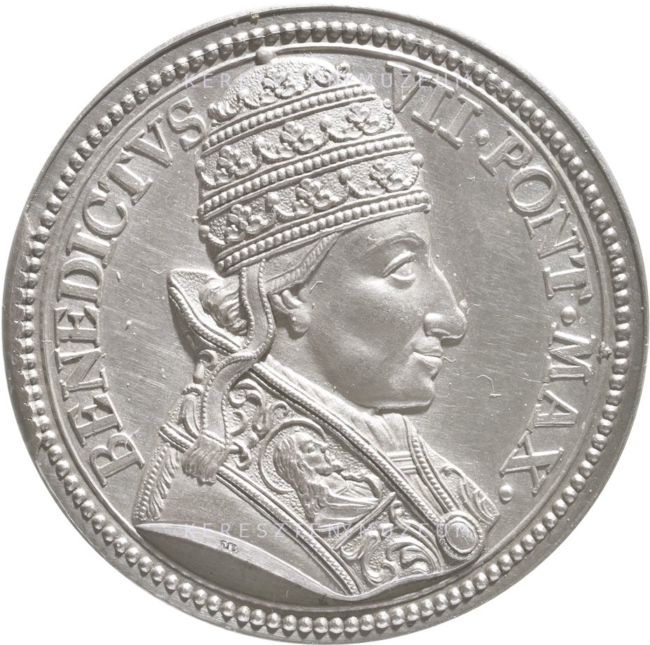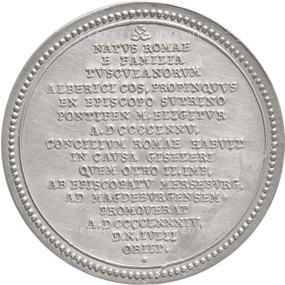 Előlap: BENEDICTVS _ VII • PONT • MAX • | Hátlap: NATVS ROMAE | E FAMILIA | TVSCVLANORVM | ALBERICI COS. PROPINQVVS | EX EPISCOPO SVTRINO | PONTIFEX M. ELIGITVR | A. DCCCCLXXV. | CONCILIVM ROMAE HABVIT | IN CAVSA GISELERI | QVEM OTHO II. IMP. | AB EPISCOPATV MERSEBVRG. | AD MAGDEBVRGENSEM | PROMOVERAT | A. DCCCCLXXXIV. | D. X. IVLII | OBIIT •