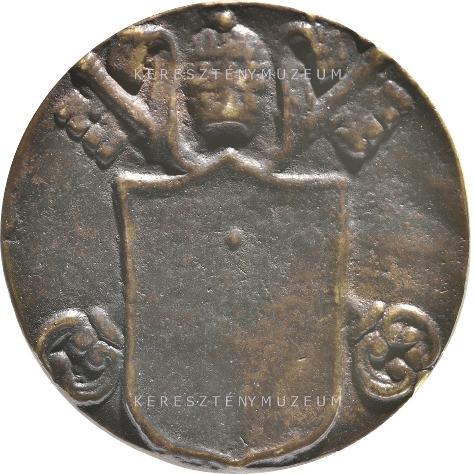 Restitúciós érem, perem nélkül. Előlap: a pápa mellképe jobbról, vállán palást, feje fedetlen.Hátlap: anepigrafikus - üres címerpajzs, a pápai hatalmat jelképező, keresztezett kulcsokra helyezve, tiarával koronázva.