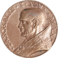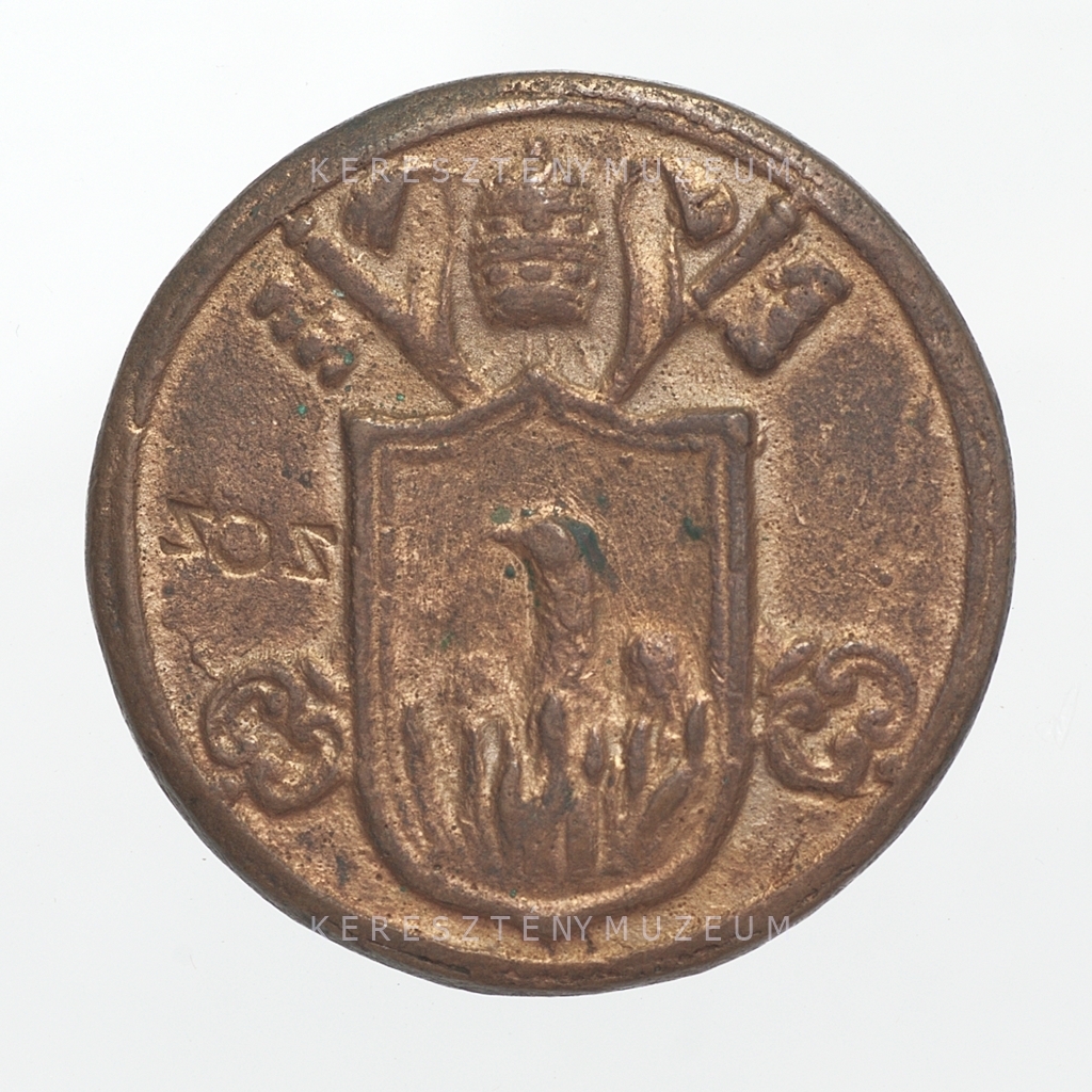 Restitúciós érem, sima perem, enyhén kopott. Előlap: a pápa mellképe bal nézetből. Vállán palást, feje fedetlen. Hátlap: Szent Péter és Szent Pál apostolok egymással szembe néző mellképei. Beütött: C.