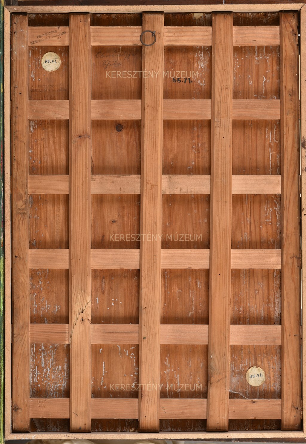 A garamszentbenedeki Kálvária oltár egyik mozgózárnyának külső képe. Az oltár a garamszentbenedeki bencés kolostortemplom késő-gótikus berendezésének részét képezte. Szekrénye az 1905-ben, az esztergomi prímási palotában keletkezett tűzvészben megégett, szerkezetéből csak a fölső és a két oldalsó keretléc maradt meg elszenesedve. Erősen megsérültek a szekrény szobrai is. Az oltár ép állapotát a Simor-emlékkönyvben, 1886-ban közölt arhív felvételről jól ismerjük. A szekrény hátlapját eredetileg (minden bizonnyal kék alapon) arany csillagok díszítették.