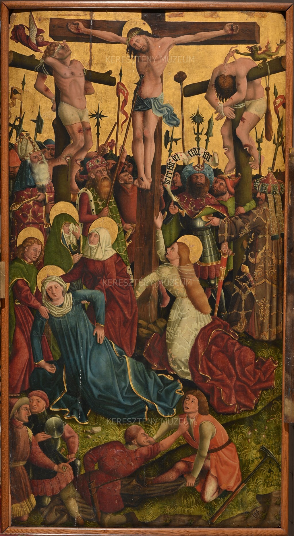 A százados feje fölötti írásszalagon “Vere filius Dei erat iste” (Mt 27, 54) felirat olvasható. A festmény stílusán németalföldi hatás érezhető, Szent János Evangélista és Mária kettősének előképe minden kétséget kizáróan Rogier van der Weyden alkotásaihoz köthető. A legfrissebb szakirodalom bajor mester alkotásaként határozta meg a képet. A jobb alsó sarokban olvasható ligatúrás HB monogramm és 1522-es dátum minden bizonnyal utólagos.