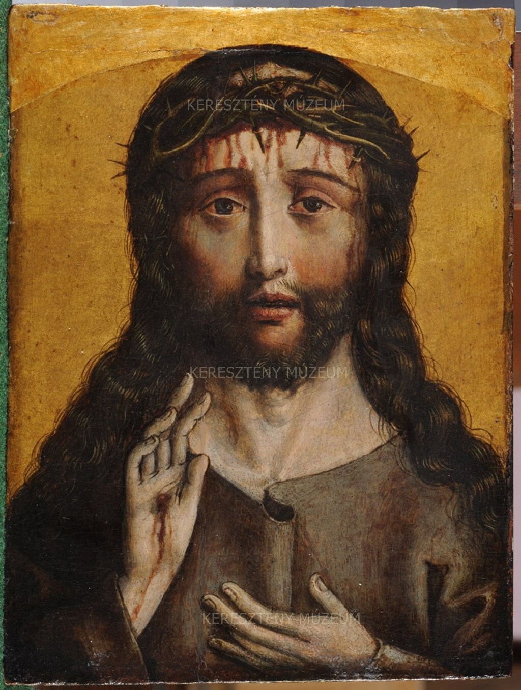 Az Áldó Krisztus és a Fájdalmas Krisztus típusának elemeit ötvöző ábrázolás. Eredetileg feltehetően mindkét oldalán festett, utóbb kettéfűrészelt, esetleg sorvasztással elvékonyított hordozón látható táblakép, amelynek felső részét ívesre kerekítették, majd utólag a hiányt kiegészítették. Alján és mindkét oldalán az eredeti képszél nyomai látszanak, mérete tehát ezekben az irányokban az eredetivel egyező.