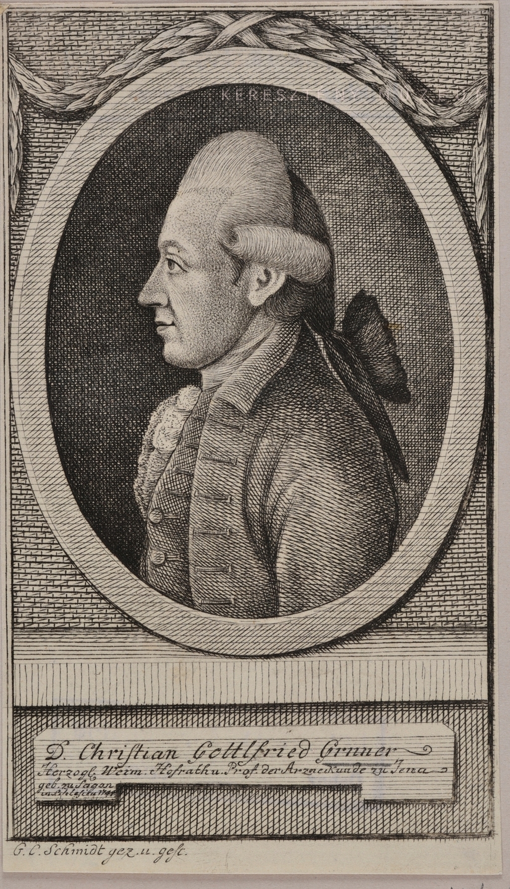 D. Christian Gottfried Gruner / Herzogl. Weim. Hofrath u. Prof. Der Arzneikunde zu Jena / geb. Zu Sagan in Schlesien 1744 […]