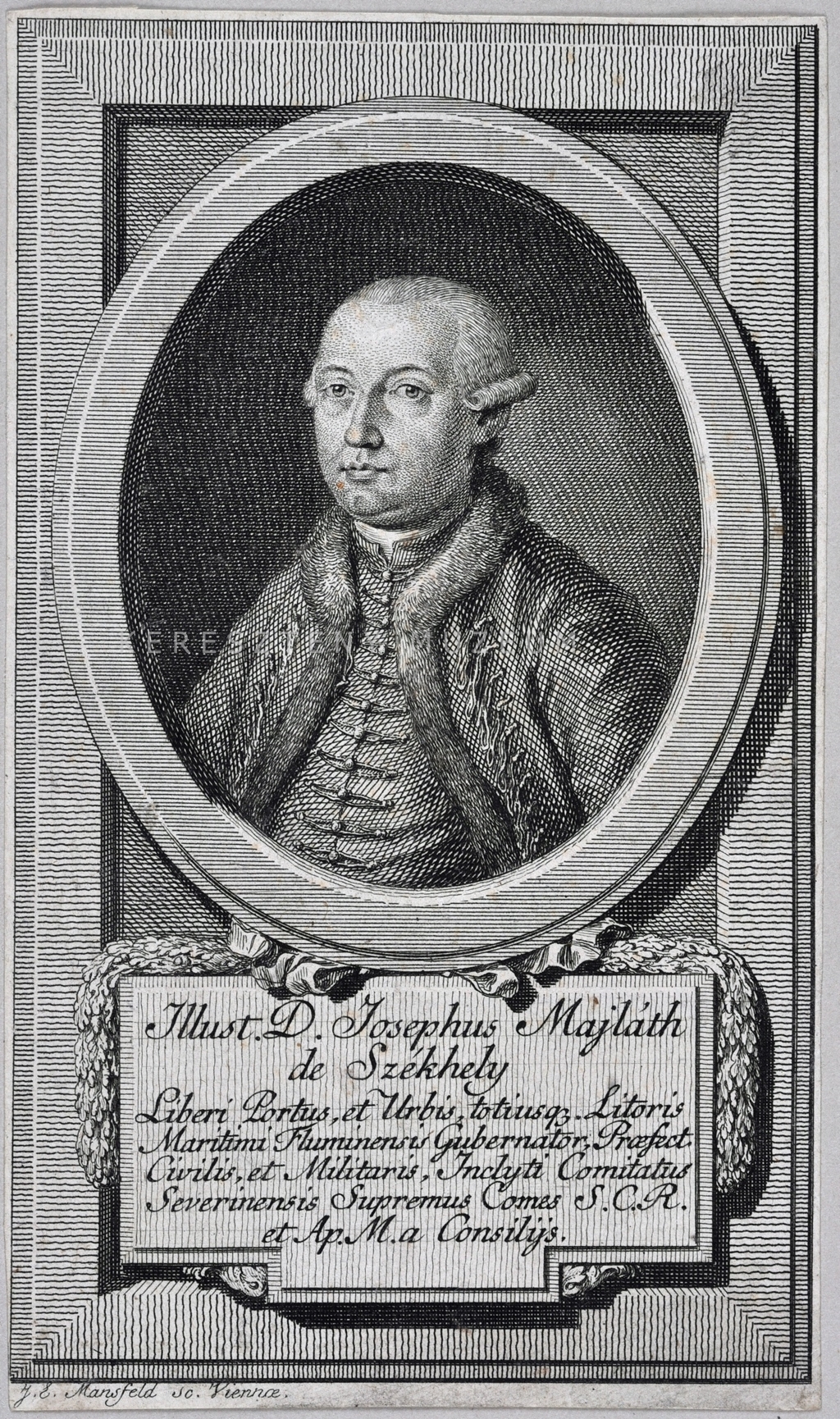 Illust. D. Josephus Majláth / de Székely / Liberi Portus, et Urbis totiusq. Litoris / Maritimi Fluminensis Gubernator, Praefect. / Civilis, et Militaris, Inclyti Comitatus / Severinensis Supremus Comes S. C. R. / et Ap. M. a Consiliis.