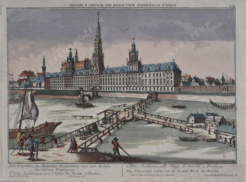 Fent (tükörképesen): EDIFICE ACADÉMIQUE, AVEC L' EGLISE DES IESUITES À BRESLAU. Lent, balra: Aula Leopoldina seu Aedificium Academicum, una cum Ecclesia / Iesuitarum Vratislaviae. / Edifice Académique, avec l' Eglise des Jésuites à Breslau. Lent, jobbra: Edificio Academico, colla Chiesa dé Giesuiti à Breslavia. / Das Universitäts Gebäu, mit der Iesuitter Kirch zu Breslau. Egyéb felirat: A jobb felső sarokban: 251. A bal alsó sarokban: Med. Fol.o N.o 61.