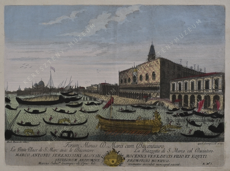 Forum Minus D. Marci cum Bucentauro. / La Petite place de S. Marc avec le Bucentore. / La Piazzetta di S. Marco col Bucintoro. | Ajánlás: MARCO ANTONIO SERENISSIMI ALOYSII MOCENICI VENE. DUCIS FILIO Et EQUITI / STUDIORUM ARTIUMQUE PROMOTORI MUNIFICO. Marcus Sebas.us Giampiccoli Opus: hoc reverenter inscribit. nuncupat. sacrat. K. N.o 1.