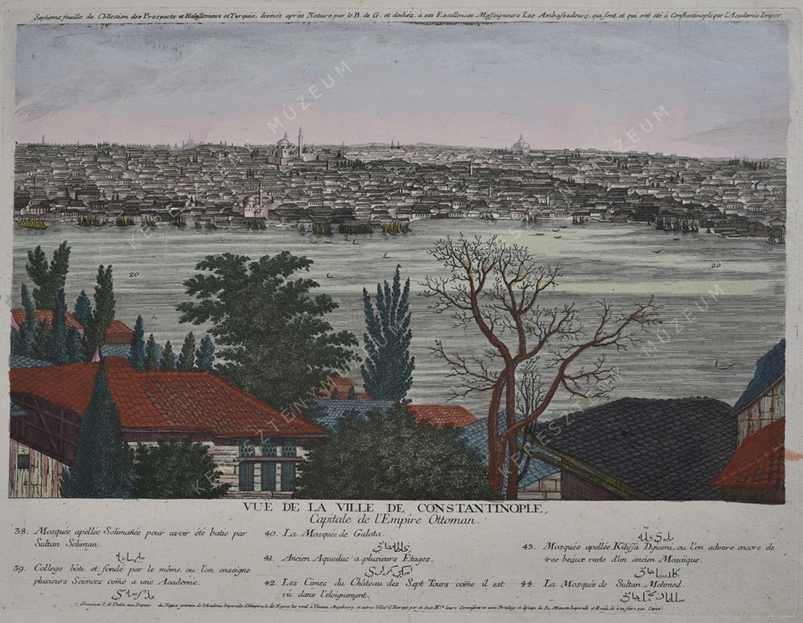 Cím: VUE DE LA VILLE DE CONSTANTINOPLE Capitale de l'Empire Ottoman. | Septieme feuille de Collection des Prospects et Habillemens en Turquie, desinés après Nature par le B. de G. et dediés, a ses Excellences Messeigneurs les Ambassadeurs, qui sont, et qui ont eté à Constantinople par l'Academie Imper. | A cím alatt jelkulcs 32-37. számig, latin és arab betűs magyarázatokkal.