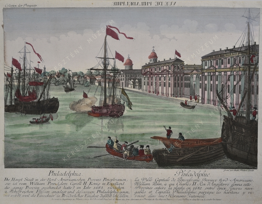 Die Haupt Stadt in der Nord-Americanischen Provinz Pensylvanien, / sie ist vom William Penn (dem Caroll II. König in Engelland, / die ganze Provinz geschencket hatte) im Iahr 1682. zwischen / 2. Schiffreichen Flüßen angelegt und deßwegen Philadelphia genen- / net worde[n], weil die Einwohner in Brüderlicher Einigkeit daselbst lebe[n] sollen. // Philadelphie. / La Ville capitale de Pensylvanie, Province Nord-Americaine, / William Penn, à qui Charles II Roi d'Angleterre donna cette / Province entiére la planta en 1682, entre deux fleuves navi- / gables et l'apella Philadelphie, parceque les habitans y vi- /voient dans une Harmonie fraternelle.