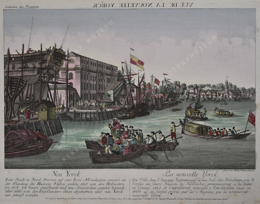 Neu Yorck. / Eine Stadt in Nord-America auf einer Insul Manahattan genannt an / der Mündung des Hudsons Flußes welche 1615 von den Holländern / zu erst zu bauen angefangen und neu Amsterdam genenet, hernach / aber 1666. von den Engelländern ihnen abgenomen und neu Yorck / um getauft worden. // La nouvelle Yorck. / Une Ville dans l'Amerique Septentrionale sur une Isle, dite Manahatan, près de / l'orifice du fleuve Hudson, les Hollandois commencérent a la battir / en l'année 1615 et l'appellerent nouvelle Amsterdam, mais en / 1666 ils en fierent privés par les Anglois, qui la nommérent nouvelle Yorck.