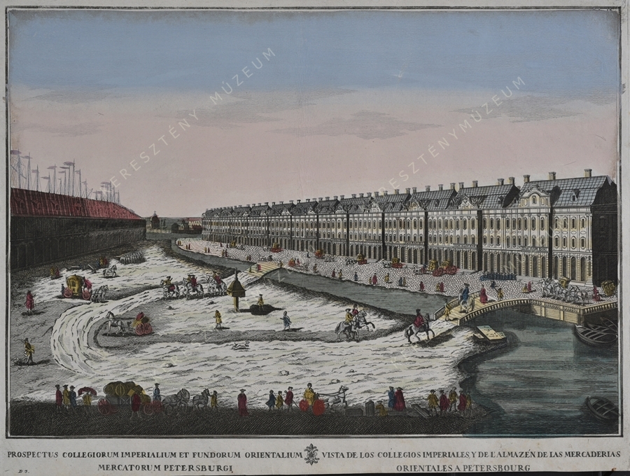 PROSPECTUM COLLEGIORUM IMPERIALIUM ET FUNDORUM ORIENTALIUM MERCATORUM PETERSBURGI // VISTA DE LOS COLLEGIOS IMPERIALES, Y DE L'ALMAZÉN DE LAS MERCADERIAS ORIENTALES A PETERSBOURG | bal alsó sarokban: D 3.