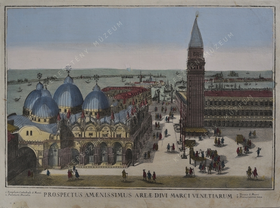 Cím a kép alatt: PROSPECTUS AMAENISSIMUS AREAE DIVI MARCI VENETIARUM | A cím kétoldalán négy megszámozott épület nevei: 1) Templum Cathedrale S. Marci, 2) Palatium Ducalis, 3) Turris S. Marci, 4) Procuratoria nova. | bal alsó sarokban: G 2.
