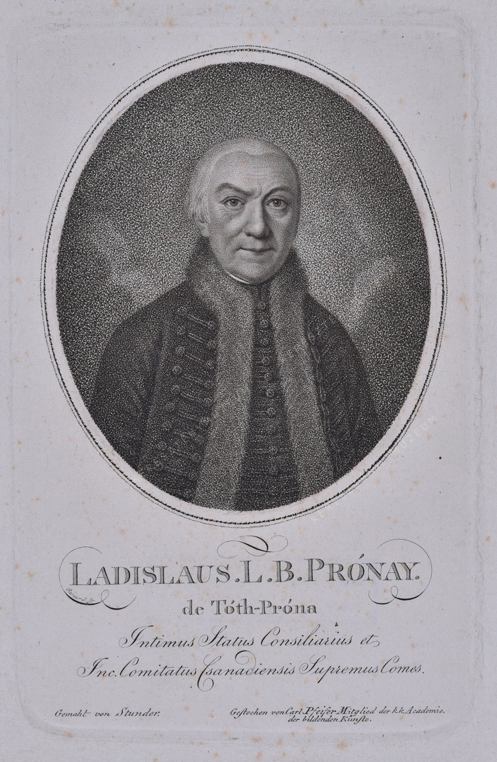 LADISLAUS L. B. PRÓNAY. / de Tóth-Próna / Intimus Status Consiliarius et / Inc. Comitatus Csanadiensis Supremus Comes.