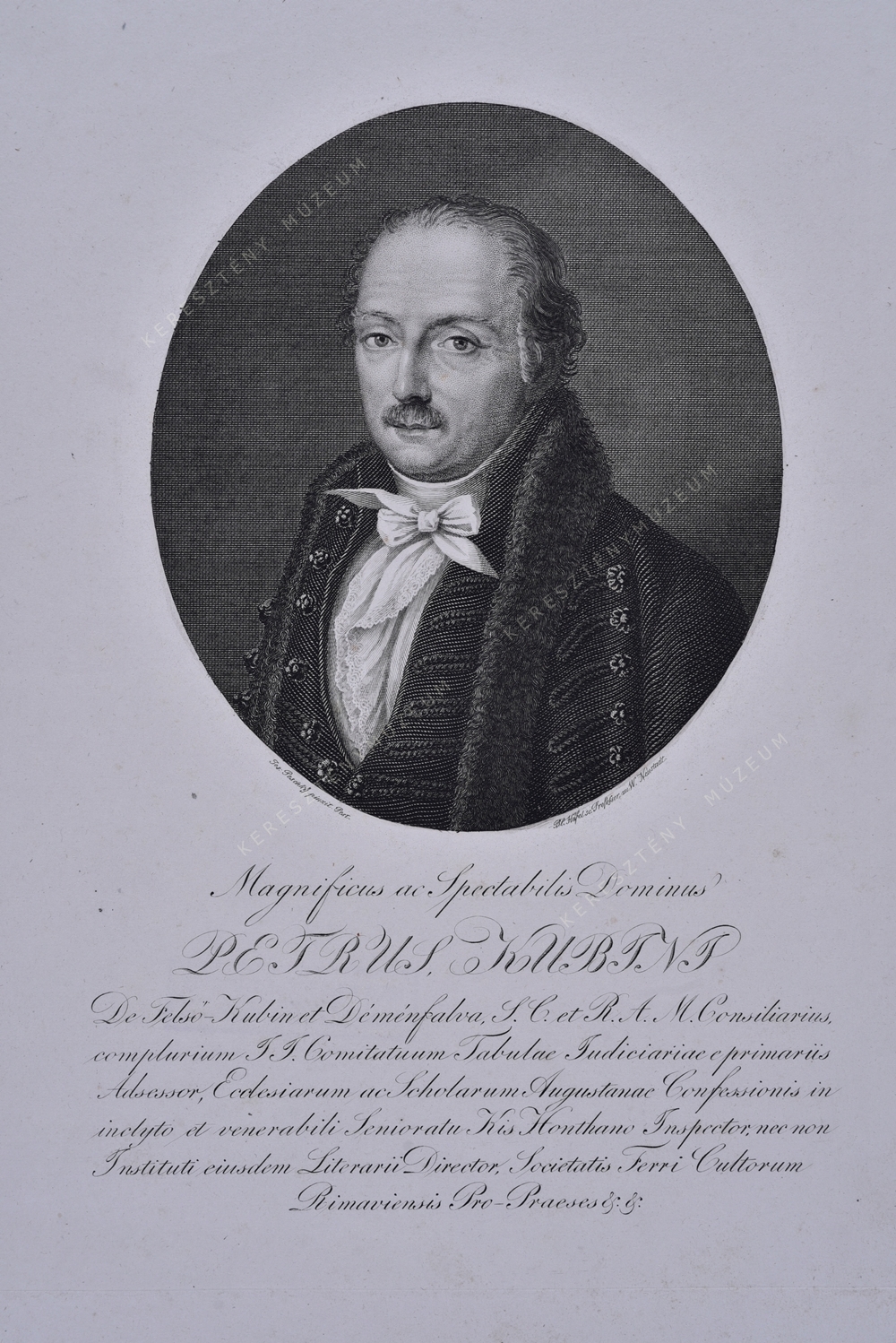 Magnificus ac Spectabilis Dominus / PETRUS KUBINI / De Felső-Kubin et Déménfalva, S. C. et R. A. M. Consiliarius, / complurium I. I. Comitatuum Tabulae Iudiciariae e primariis / Adsessor, Ecclesiarum et Scholarum Augustanae Confessionis in / inclyto et venerabili Senioratu Kis Honthano Inspector, necnon / Instituti eiusdem Literarii Director, Societatis Ferri Cultorum / Rimaviensis Pro-Praeses, &. &.