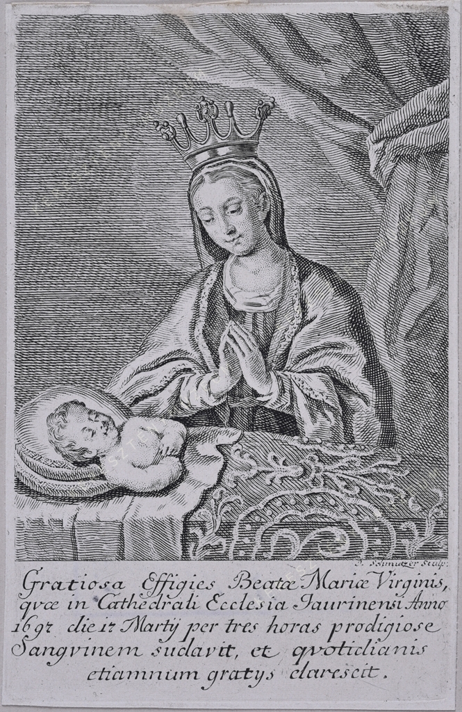 Gratiosa Effigies Beatae Mariae Virginis, / qvae in Cathedrali Ecclesia Iauriensi Anno / 1697 die 17 Marty per tres horas prodigiose / Sangvinem sudavit, et qvotidianis / etiamnum gratys clarescit.